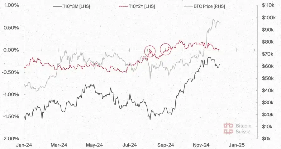 美国收益率曲线已连续倒挂超过 24 个月,成为记录中最长的时期之一。尽管 2 年期和 10 年期国债收益率的利差(2 y 10 y)最近恢复正常,但 3 个月和 10 年期国债收益率曲线(3 m 10 y)仍然严重倒挂,显示市场失衡仍在继续。比特币(BTC)对这些变化表现出显著敏感性,例如, 2024 年 8 月,当 2 y 10 y 曲线暂时恢复正常时,比特币盘中一度暴跌 9, 000 美元(-15% )。随着收益率曲线短端逐步正常化,预计波动性将持续,这可能创造短期买入机会。然而,下行风险看似有限,因市场看涨情绪和经济条件趋于稳定,但前提是能够避免主要经济衰退风险。