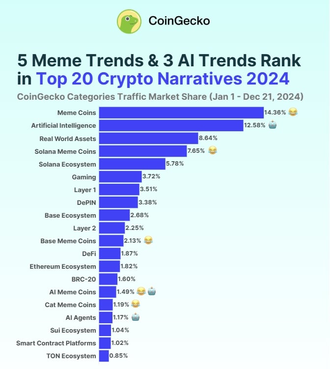 2024 加密叙事排行榜:迷因币称王,AI、RWA、Solana生态崛起