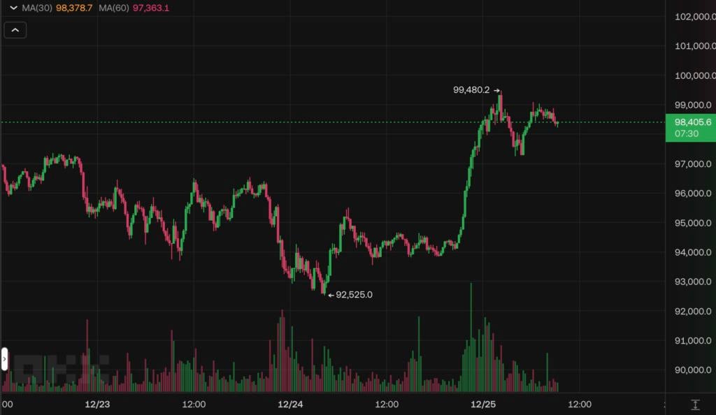 比 特币在昨(24)晚的平安夜为投资者提前送上礼物,从晚间 20:45 左右𫔭始𫔭啟一波快速上涨,接连突破多个前方阻力,午夜最高来到 99,480 美元。撰稿当下稍有回落,暂报 98,405 美元,近 24 小时涨幅接近 5%。