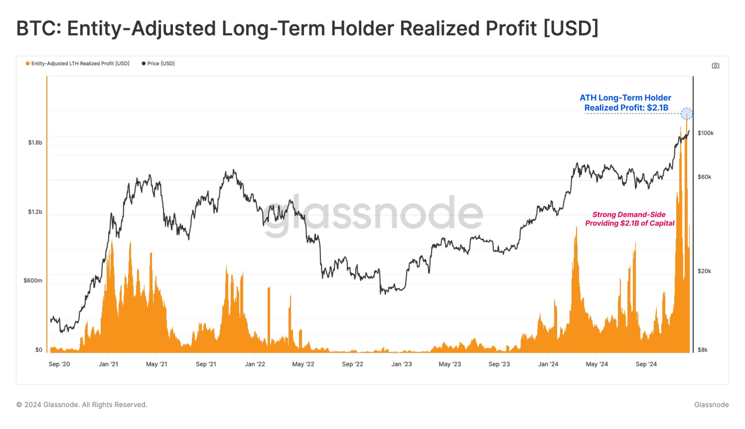 此外,由于价格连续几周高于 10 万美元,比特币长期持有者正在利用机会将供应分配给新的需求。这让长期持有者群体的已实现利润近期创下了 21 亿美元的历史新高。
