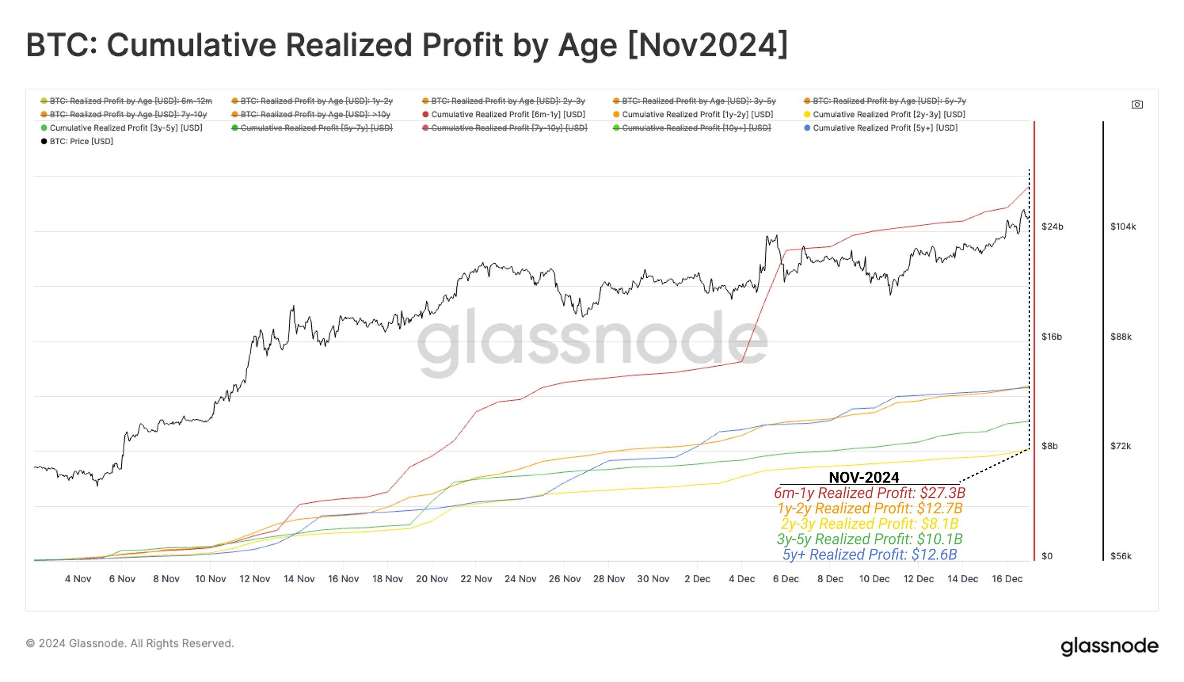而年龄在 6 至 12 个月之间的比特币则主导了当前的卖压,自去年 11 月以来已实现 273 亿美元的利润,占整体的 38.5%。相较之下,年龄超过此的代币仍处于相对休眠状态。