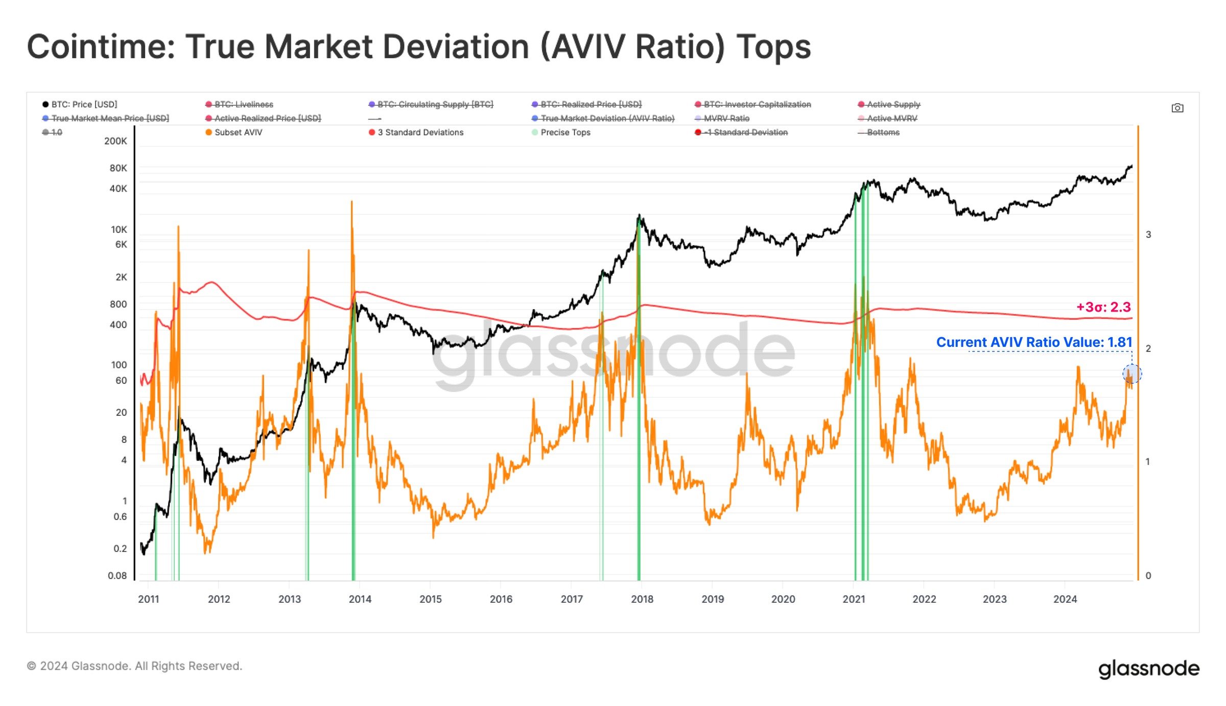 最后,报告观察了 AVIV 比率,该指标有助于评估市场上活跃投资者持有的平均未实现利润(帐面收益),以衡量市场目前相对于参与者的获利能力是否过热。