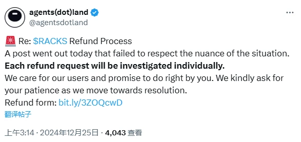 推出 MAX 代币质押获得其 AI Agent 发行平台代币的初始份额,但随后的首个发行的项目 RACKS 由于出现狙击机器人等因素导致项目发售失败,目前已开启退款流程。