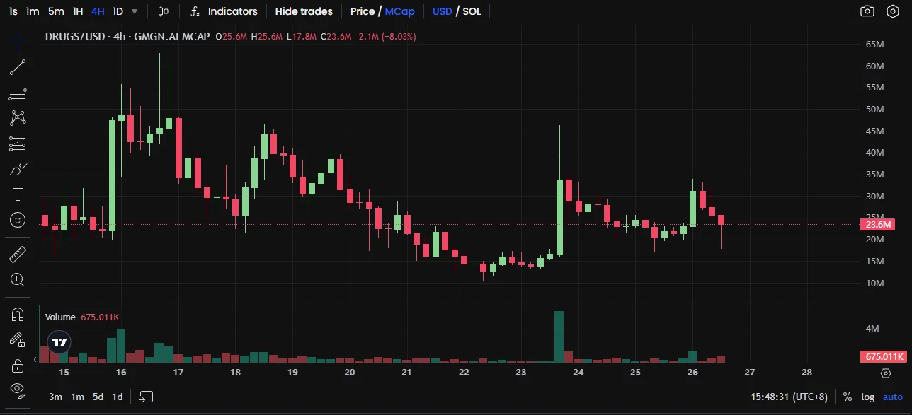 据 GMGN 数据 ,DRUGS 市值从最高触及 6000 万美元,目前市值 2300 万美元。