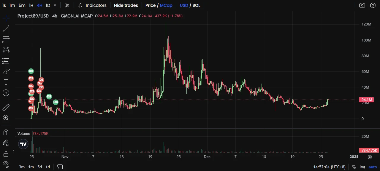 据 GMGN 数据 , Project89 市值从最高短时突破 1 亿美元,目前市值 2400 万美元。