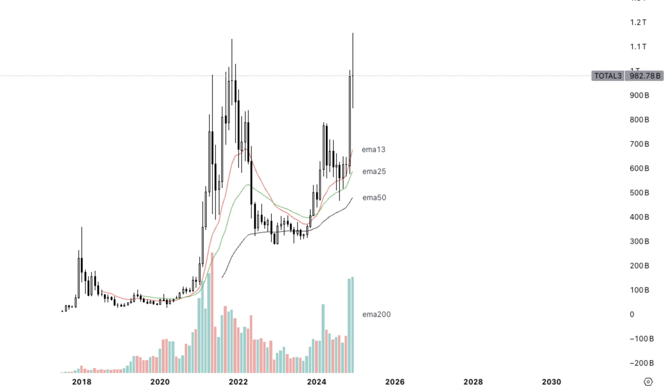 Tota l3(Odaily 注:除去 BTC、ETH 之外的山寨币总值)在 2024 年第一季度达到了 2021 年的高点,然后在 20424 年第四季度达到周期高点。老实说,我的情景假设一和情景假设二并无太大区别。