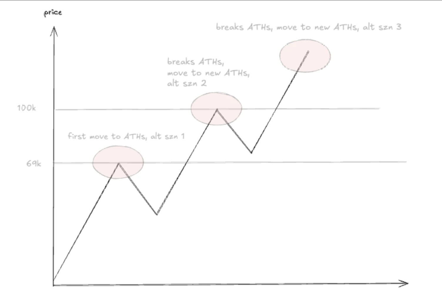 下一轮山寨币周期很可能始于 BTC 站稳 10 万美元上方之后 。我无法预知未来, 虽然我希望这将在 2025 年第一季度发生,但基于事实考虑,我们也有可能在未来几个月看到 2024 年 Q2、Q3 震荡行情的重演 —— 我必须对此做好准备。因此,以下是我绘制的所有情景假设情况。