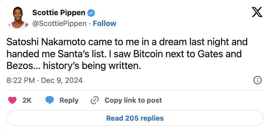 “昨晚,中本聪在梦里给了我圣诞老人的名单。我看到比特币与盖茨和贝索斯的名字并列……历史正在被书写。”—— Scottie Pippen , 2024 年 12 月 9 日。