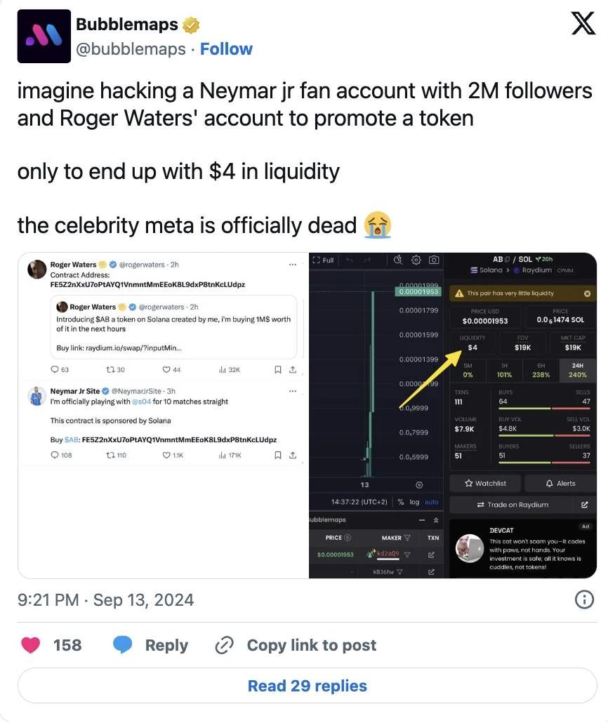 尽管这些名人推文覆盖了超过 300 万人,这枚代币的市值却仅仅达到 1.9 万美元。更令人尴尬的是,它只有 24 名持有者,流动性仅为 4 美元。你可能已经猜到,这些名人实际上与代币毫无关系,他们的 X(推特)账号被黑客入侵了。