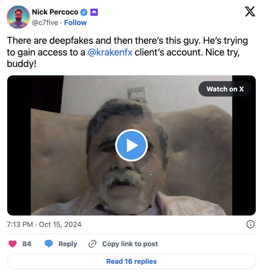 “我们的客服人员当时心想:这也太荒唐了吧。这人居然戴着个橡胶面具,”Kraken 的首席安全官 Nick Percoco 在接受 Decrypt 采访时说道。