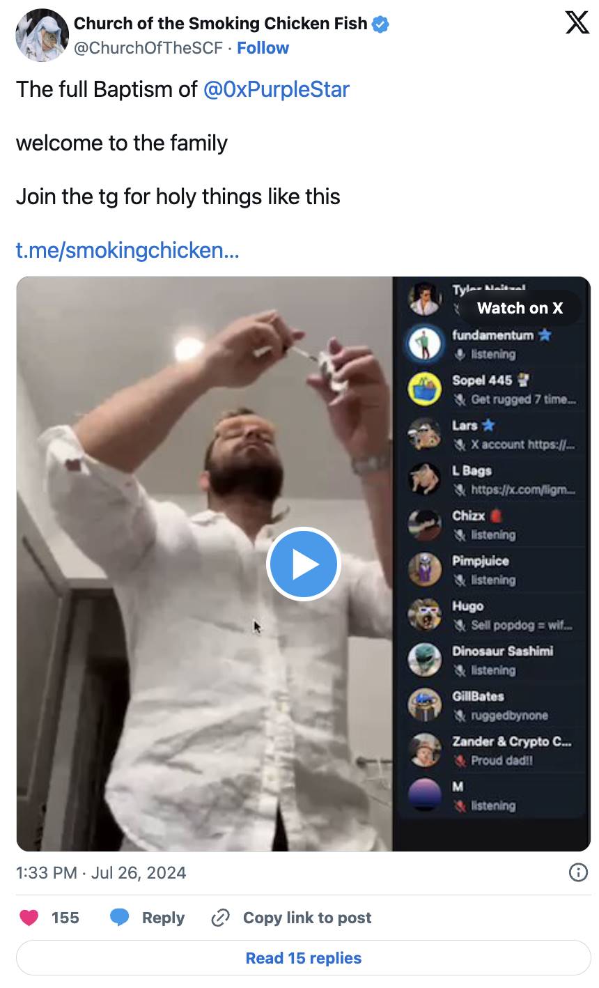 这个名为“吸烟鸡鱼教会 (Church of the Smoking Chicken Fish)”的宗教是基于 Meme 代币建立的,而信徒们的“洗礼仪式”被称为“肉汤仪式 (brothism)”。通常情况下,这个仪式只需要在 Twitter Spaces 上朗读所谓的“十条鸡诫 ( 10 chickemandments)”即可完成。然而,有一位信徒决定“另辟蹊径”:他全身穿着衣服,坐在浴缸里,头顶放着一只生鸡,朗读这些“教义”。