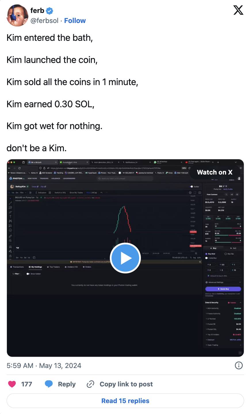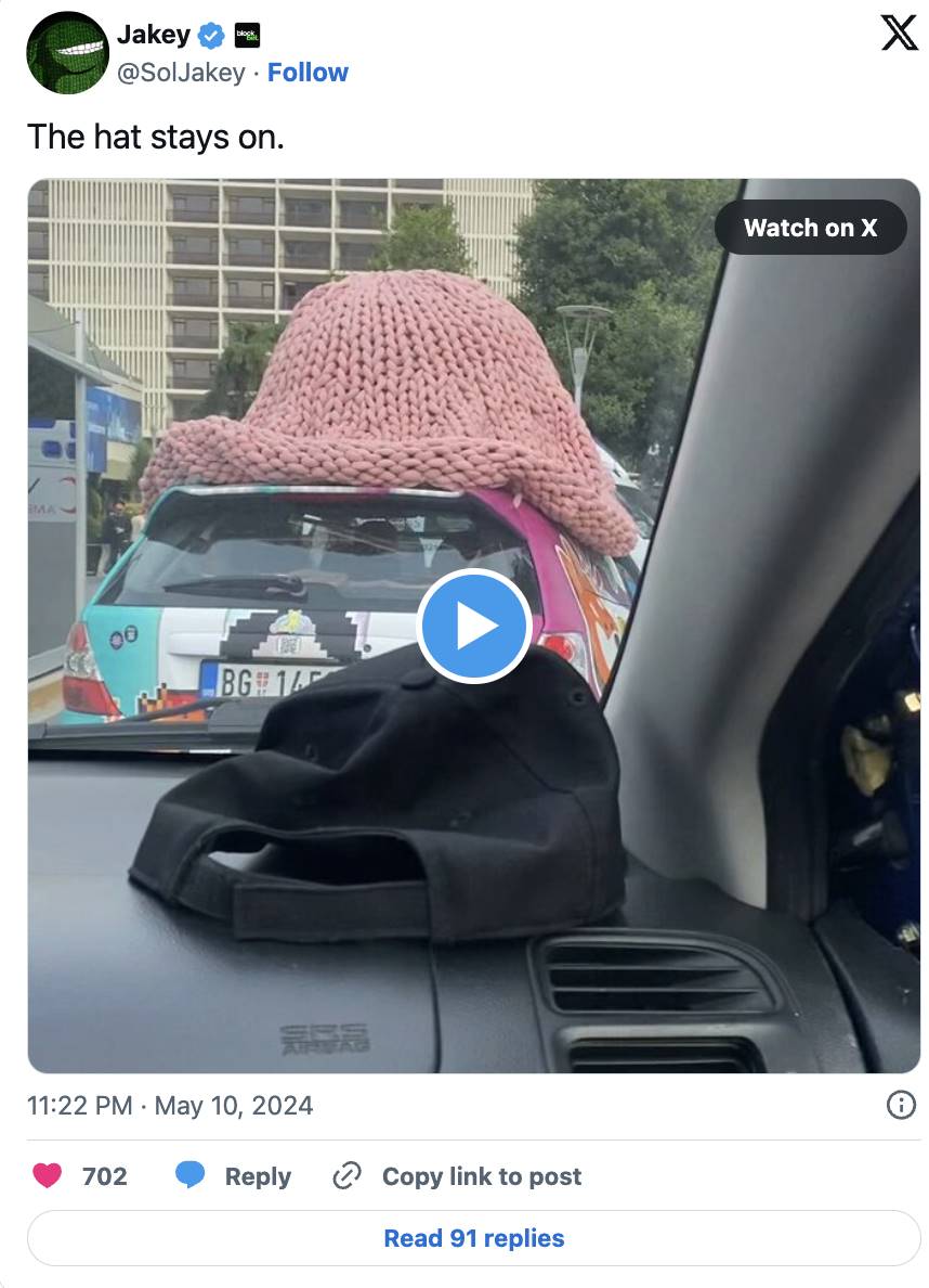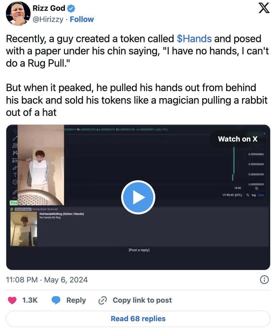 其中一位开发者创建了一个名为 $Hands 的 Token,并在直播中举着一张纸,上面写着:“我没有手,所以不能跑路。”然而,当 Token 价格达到高峰时,他却突然露出双手并抛售了所有 Token,像魔术师变戏法一样。—— @Hirizzy , 2024 年 5 月 6 日。