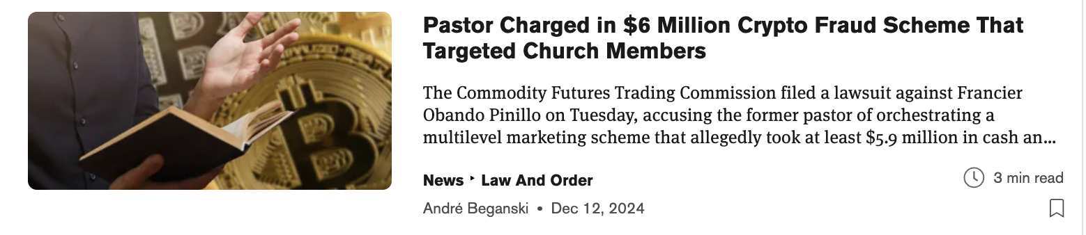 商品期货交易委员会 (CFTC) 已对这名前牧师提起诉讼,指控他通过一个名为“Solanofi 平台”的虚假多层次营销计划,非法获取了超过 590 万美元的现金和数字资产。据起诉书指出,这位前牧师利用所谓的“杠杆质押平台”吸引投资者,声称他们每月可获得高达 34.9% 的收益,目标则是那些“缺乏投资经验”的普通人。
