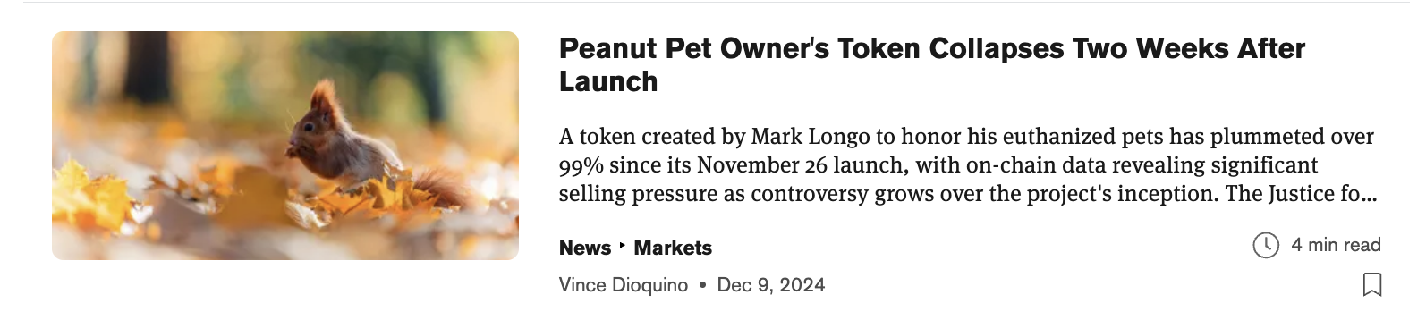 在“已死但并非狂犬病感染”的松鼠 Peanut 的故事引发全球关注不到一个月后,这只啮齿动物的主人也加入了加密货币的狂欢。他显然对那些从他的个人悲剧中牟利的“投机者”感到愤怒,于是决定推出自己的代币。然而,这一切发生在“PNUT 社区”据称已向他捐赠了 5 万美元之后。