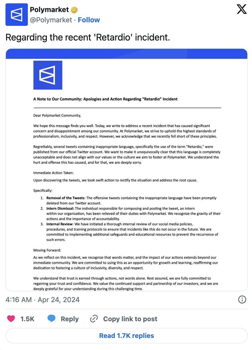 币安在声明中解释道:“这名实习生在社区中看到这张 Meme 图片时,并没有理解其真正的含义,就直接发布到了 X 上。这是我们的失误,我们会确保解决这个问题。”为此,币安表示,他们的解决方案是聘请一名新的实习生以避免类似问题再次发生。