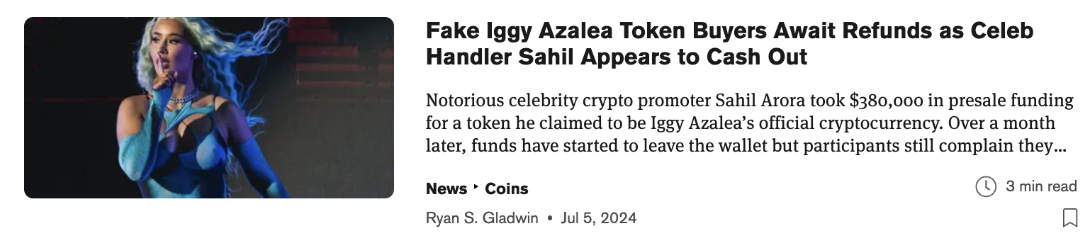 Caitlyn Jenner 声称,她的 JENNER 项目被开发者 Sahil Arora 利用,而后者因策划短命的名人项目和诈骗闻名。今年,他通过一个 Iggy Azalea 代币 的预售骗取了 38 万美元,而 Iggy 本人早已否认与此项目有关联。