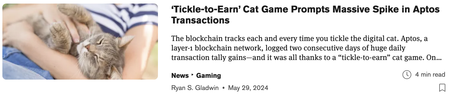 Tapos 是一款基于 Aptos 网络的 “撸猫赚钱”游戏 ,玩家通过挠屏幕上的猫来赚取 HEART 代币。这款游戏在短短两天内帮助 Aptos 网络记录了超过 2 亿次交易。尽管 8 月该游戏声称其总交易量已突破 5 亿次,但此后再未更新数据。