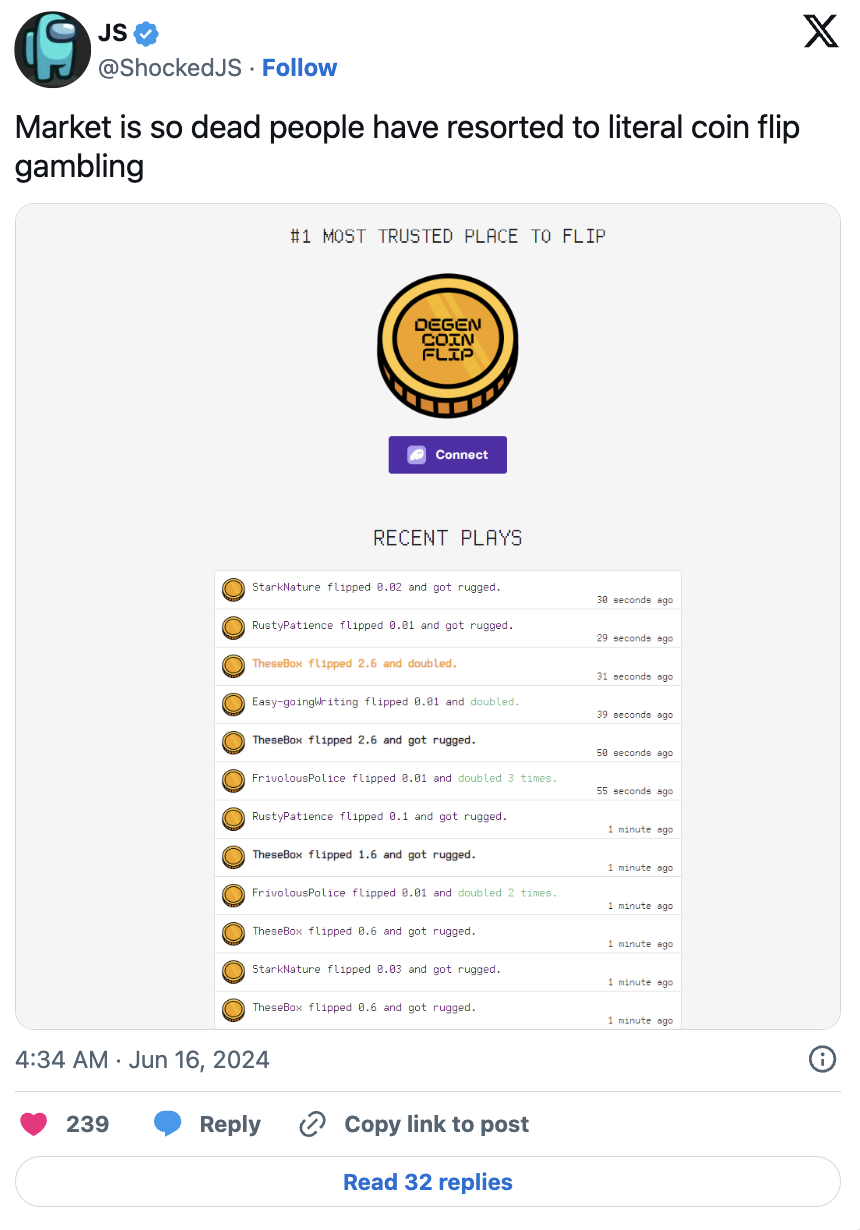 在 6 月的市场低迷期,Polymarket 上的加密玩家无聊到开始赌硬币正反面。只需将钱包连接到一个名为 Degen Coin Flips 的网站,接下来会发生什么,谁也说不准。