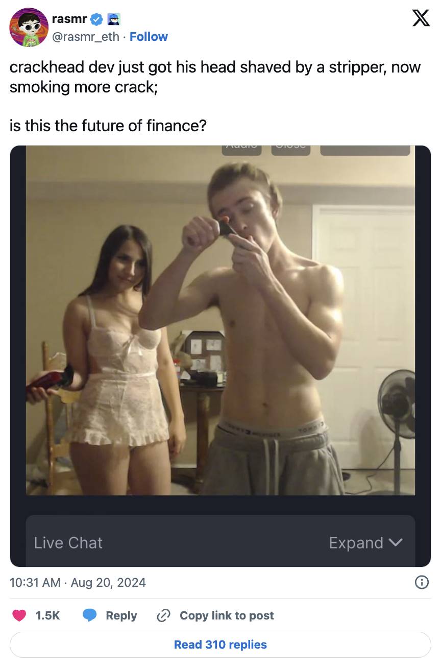 对于那些将区块链与吸毒结合的瘾君子来说,今年绝对是“高光时刻”。首先登场的是 Meth’d Up Dev,他在直播中吸食冰毒,以此为他的代币造势。接着是 Crack Head Dev,他的故事更加离奇——这位开发者在直播中因芬太尼过量昏迷,随后还假装自己死亡,最终摇身一变,成为推特上的极右翼种族主义网红。看来,有人证明了人生确实可以有“第二幕”。