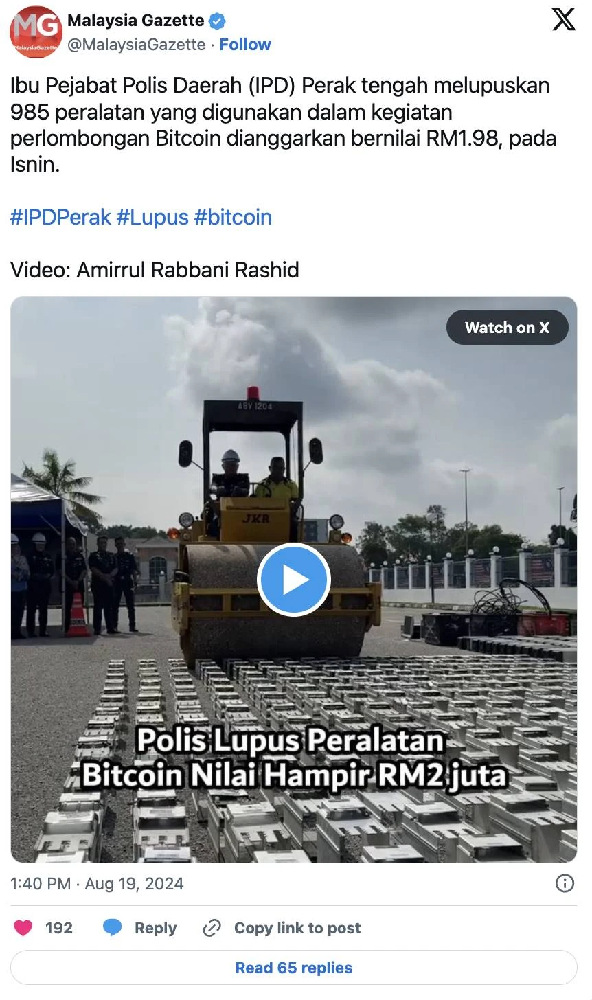 “Perak Tengah 警察总部销毁了 985 台用于比特币挖矿的设备,总价值约为 198 万马币。”—— @MalaysiaGazette , 2024 年 8 月 19 日。