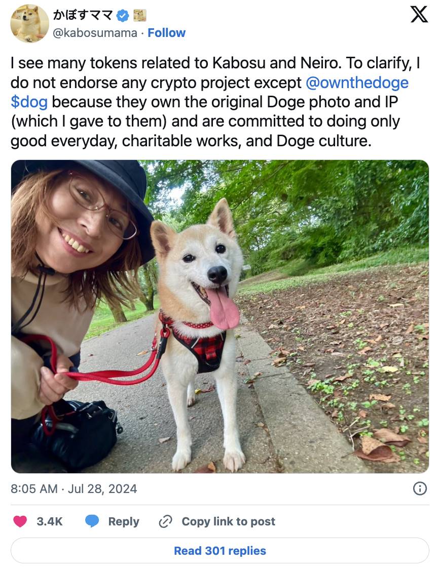 “我看到许多与 Kabosu 和 Neiro 相关的代币。澄清一下,我不支持任何加密项目,除了 @ownthedoge 的 $dog,因为他们拥有原始 Doge 照片和知识产权(我已经将其授予了他们),并致力于推广慈善事业和 Doge 文化。”—— @kabosumama , 2024 年 7 月 28 日。