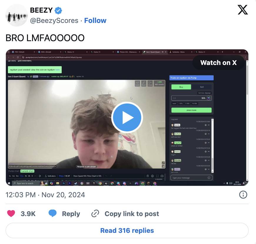 一位自称是母亲的女士与她的“儿子”一起参与了 一场直播 ,通过晃动胸部来恳求观众投资她儿子的 Meme。