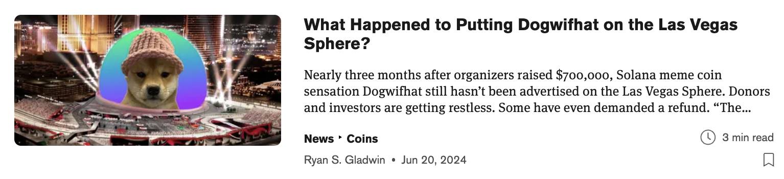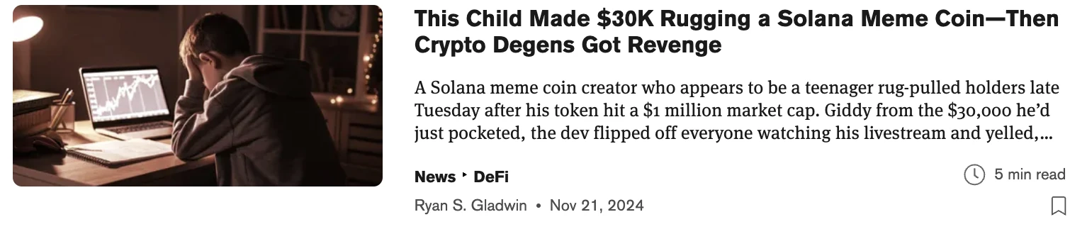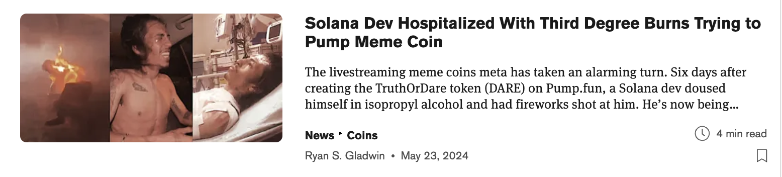 “Solana 开发者因试图推高 Meme 币价值,导致三度烧伤住院。”—— NewsCoins ,作者 Ryan S. Gladwin, 2024 年 5 月 23 日