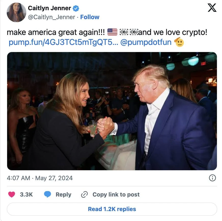 Caitlyn Jenner 曾推出一个基于奥运奖牌的 Meme 币,掀起了名人 Meme 币的热潮。然而,她在推出 Solana 代币的同一周,又在 Ethereum 上发布了一个新代币,声称支持 Donald Trump 的总统竞选。几个月后,这两个代币的市值都跌到了不足 100 万美元。