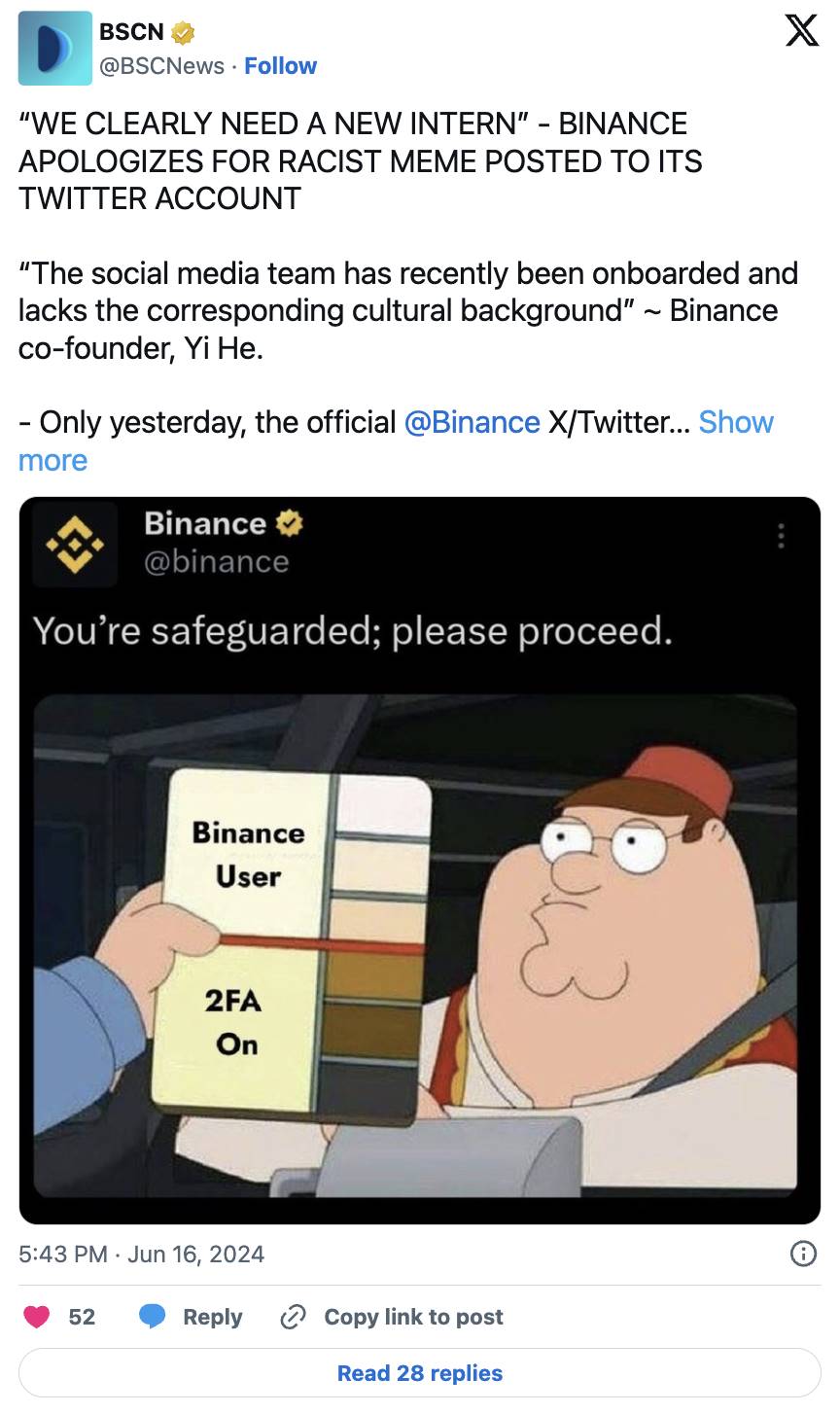 币安 (Binance),作为全球最大的加密货币交易所,今年 6 月在 X(原推特)上发布了一张 Meme 图片。这张图片被认为带有种族歧视的暗示,引发了广泛争议。对此,币安将责任归咎于其社交媒体团队的一名实习生,称其“缺乏必要的文化背景”,因此未能意识到图片的种族主义含义。