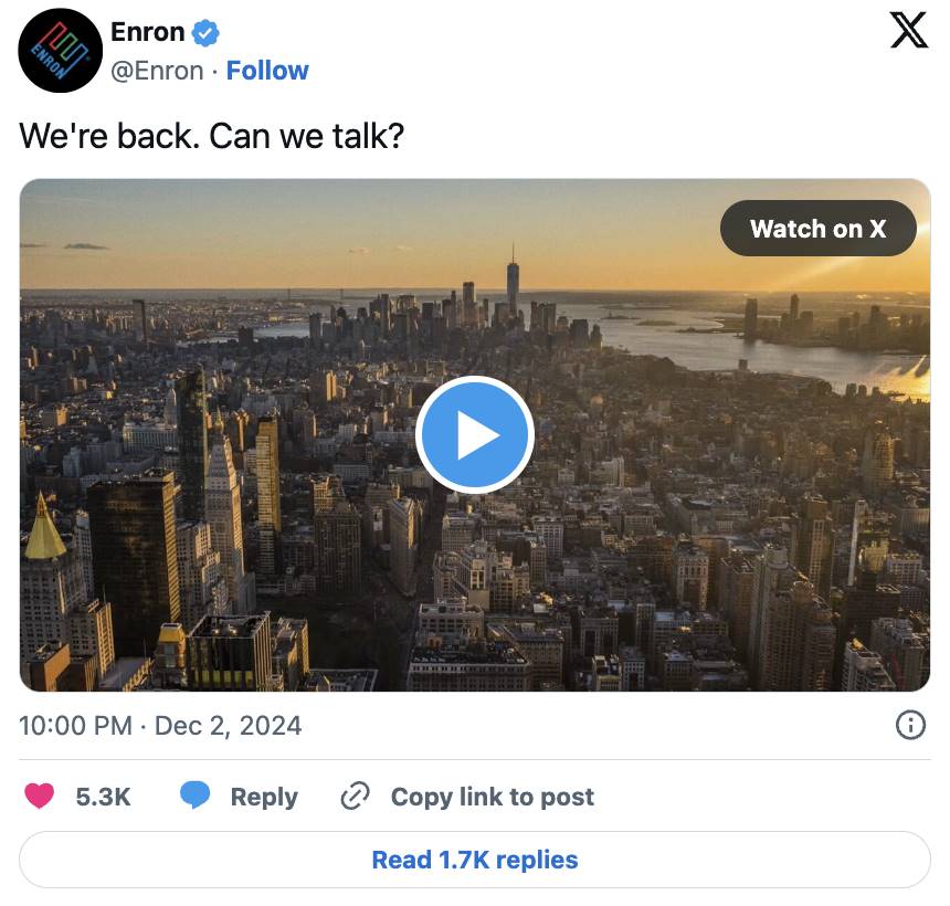 它又来了!曾经是世纪末互联网泡沫象征的 Enron,这家因财务欺诈丑闻而破产的能源巨头,在 12 月初通过 X(原推特)宣布回归,并声称将利用去中心化技术“解决全球能源危机”。目前尚不清楚这是一场纯粹的恶搞、一场认真的复出尝试,还是一场最终沦为笑话的复出闹剧。但无论如何,该公司宣称,“无许可创新”(permissionless innovation,即无需中央机构批准即可进行的开放式创新)将是其复出的核心理念。