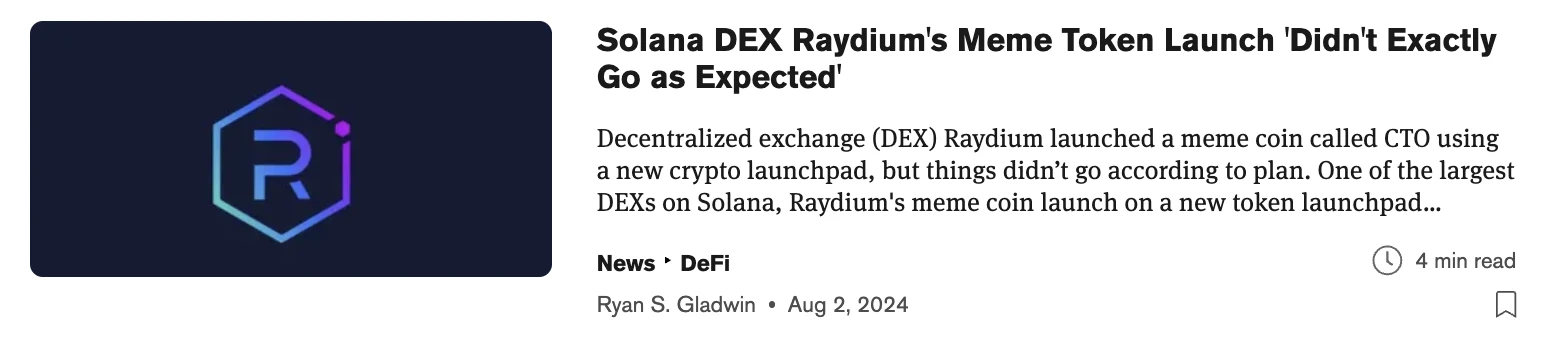 Solana 上的去中心化交易所 Raydium 最近尝试通过一个新的代币发行平台推出 Meme 币,但结果却适得其反。由于技术问题,意外生成了两个相同的代币,其中一个在短短 10 分钟内暴跌了 92% 。代币的市值从最初的 700 万美元迅速下跌到 48.8 万美元。一位用户在 Discord 上问道:“这是跑路了吗?”