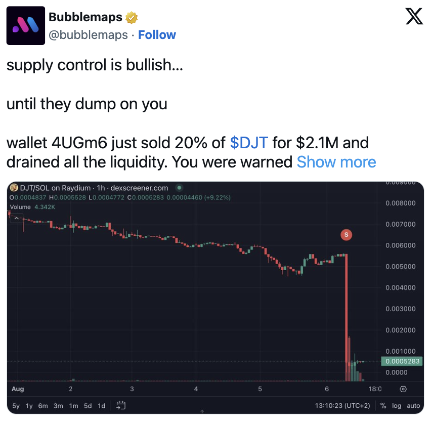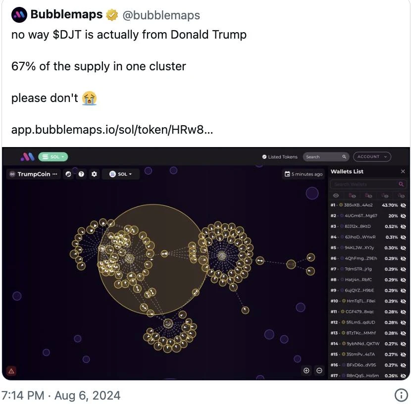 基于 Solana 的 Meme 币 TrumpCoin 声称与美国前总统特朗普有关,尽管这一点从未被证实。然而,该代币在一次“ rug-pull ”操作后,价值暴跌了 92% 。