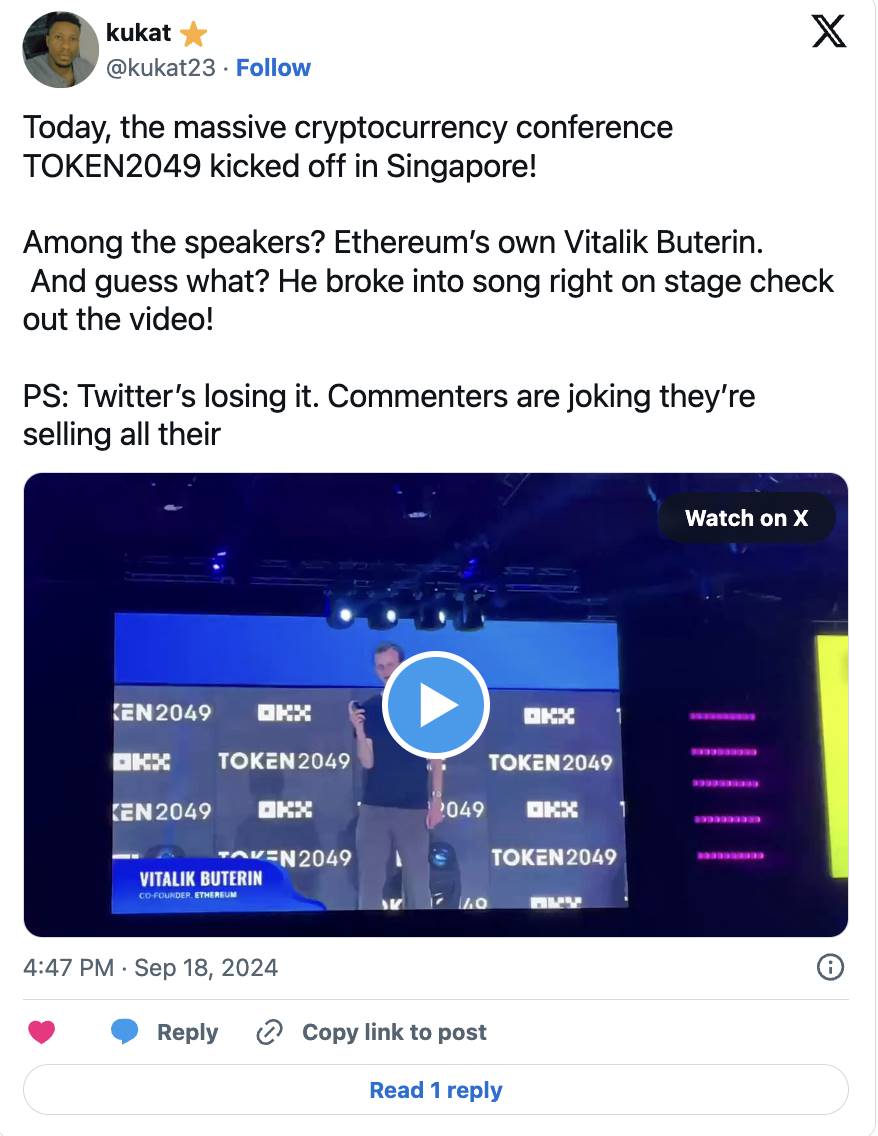 “今天,TOKEN 2049 大会在新加坡开幕!Vitalik Buterin 在台上唱起了歌,看看视频吧!”—— kukat ⭐️ (@kukat 23) 2024 年 9 月 18 日