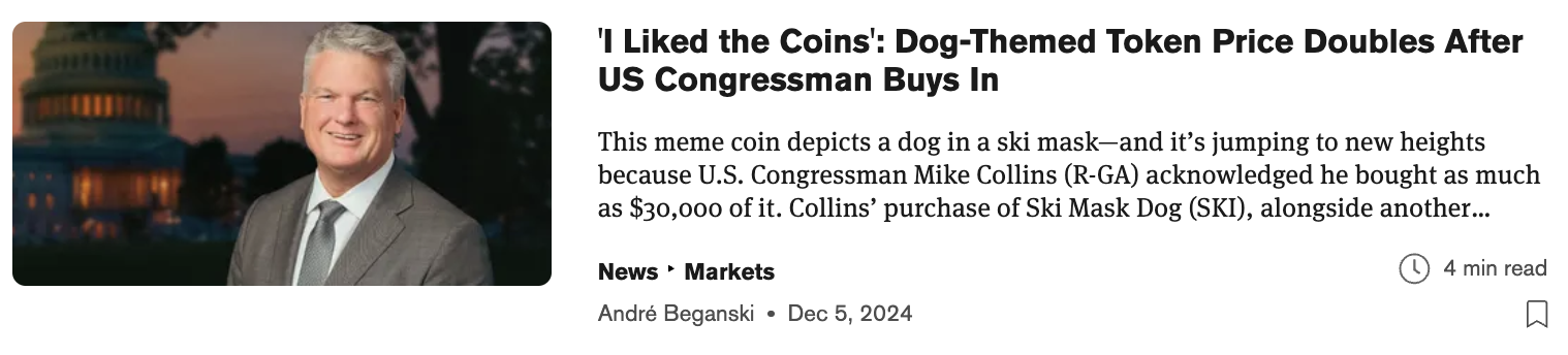 一个以戴滑雪面具的狗为主题的 Meme 币本月价格飙升,这一切都因为美国国会议员 Mike Collins 承认自己购买了价值 3 万美元的该代币。