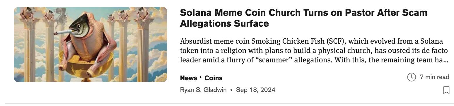 几个月后,教会领袖 Pastor Kelby 开始利用他的宗教影响力推广小市值 Meme 币,甚至接受付款。最终,他被教会驱逐,教堂计划也陷入混乱。