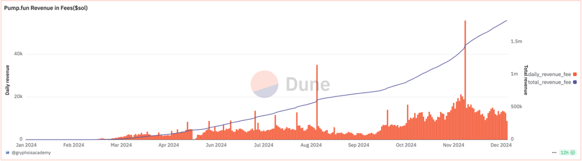 目前,据 Dune 数据显示,截至 12 月 23 日,PUMP.FUN 自上线以来,已部署近 500 万个 Memecoin,每日活跃用户数可达 30 万,日新增地址数达 17 万。据 DefiLlama 数据显示,PUMP.FUN 近 30 天协议收入更高达到 9400 万美元,累计协议收入近 3 亿美元。