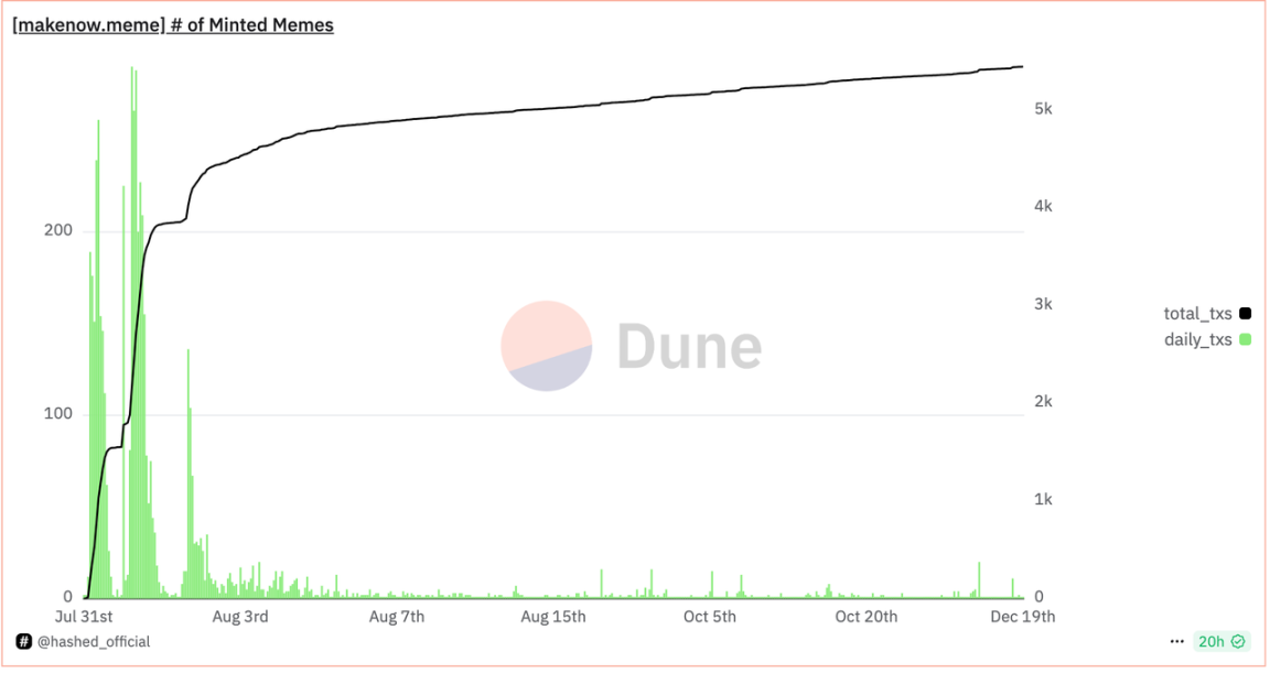 据 Dune 数据显示,MakeNow.Meme 创建一周仅后就逐渐消亡,走向无人问津的结局。这或许印证了 Memecoin 的核心叙事和主要逻辑还是对于公平的追求。