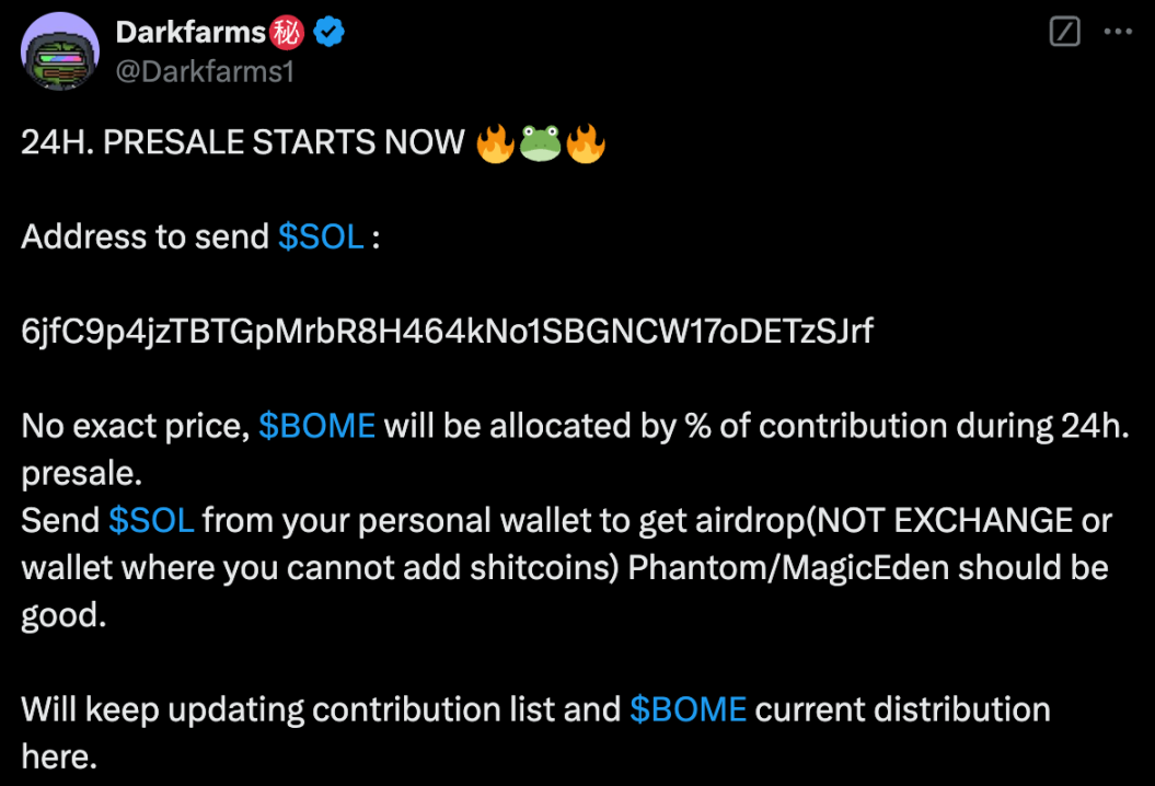BOME (BOOK OF MEME) 是 Pepe Meme 艺术家 Darkfarm 发起的预售项目,预售募资超 10000 枚 SOL,因受广泛关注代币上线交易量就破 2 亿美元,三天上线币安后市值最高超 10 亿美元;后续采取同样预售机制的 SLERF 因 DEV 意外销毁了 LP 和空投预留代币,突发事件以及后续传播使得 Meme 代币价格呈现螺旋上涨趋势。