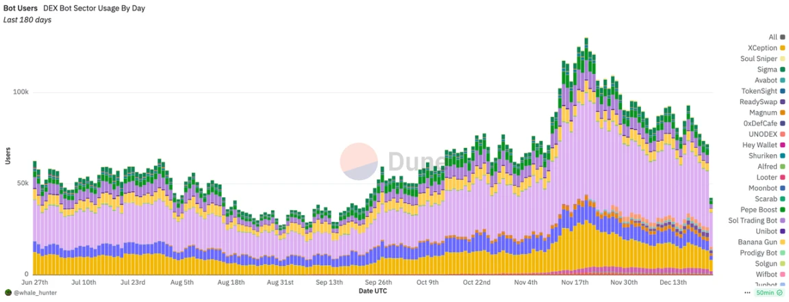 在这期间,针对 Memecoin 交易,工具从移动端向网页端进行拓展,针对不同的细分需求,既有多链兼容的专业交易网站,比如 gmgn.ai、Bullx、Photon,也有方便快捷的 TG bot 比如 Banana Gun、Tojan、Bonkbot 等。这些专门针对 Memecoin 交易的服务工具借助 Memecoin 淘金热,从全面向深度逐步过渡,关联钱包分析、推特监控、安全检测等工具日益完善,产品商业模式得到验证。在这过程中,TG Bot 用户数量也在不断增加,日活用户最高超 14 万人,日均交易额最高近 5 亿美元,虽然相对链上 DEX 还有很长一段路要走,但在 Memecoin 超级周期影响下,这个细分领域仍是蓝海。
