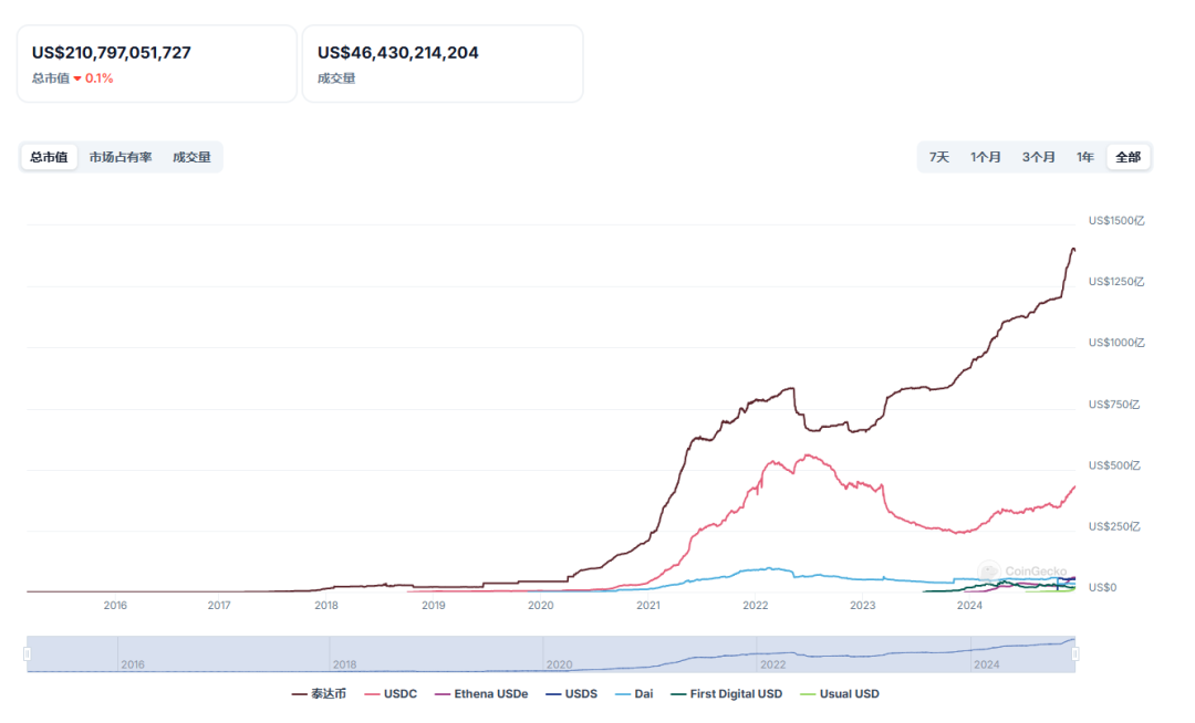 另一方面,从本轮牛市的核心驱动机构来看,无缝衔接传统金融与Web3的PayFi必然首当其冲。稳定币与RWA是其中的典型代表。稳定币在今年真正让众人期盼的大规模应用崭露头角,不仅在加密领域快速增长,在全球支付和汇款市场也开始占据一席。撒哈拉以南非洲、拉美和东欧地区开始绕过传统银行系统,直接采用稳定币进行交易结算,规模同比增长超过 40%。目前流通的稳定币价值超过2100亿美元,显著高于2020年的数十亿美元,月均超过2000万个地址在公共区块链上进行稳定币交易,仅仅2024年上半年,稳定币的结算价值就超过2.6万亿美元。从新产品来看,Ethena是今年稳定币项目中表现最为亮眼的一个,并进一步催生了生息稳定币的热潮,其也是AAVE在本年度收入的主要驱动力。而RWA,则在贝莱德官宣进入后被彻底点燃,3年前还不到20亿美元市值的RWA在今年规模已然扩展到了140亿美元,标的覆盖借贷、房地产、稳定币、债券等多个领域。