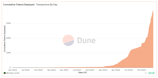 在此背景下,围绕MEME的基础设施持续夯实, 公平发射平台Pump.fun应运而生,不仅重塑MEME格局,也成功登顶今年最赚钱也最成功的应用之一,在11月,Pump.fun成为“有史以来首个月收入超过 1 亿美元的的Solana协议”。 而据 Dune数据显示,截至12月22日,pump.fun累计收入超过 3.2 亿美元,已部署代币总数约为493万。