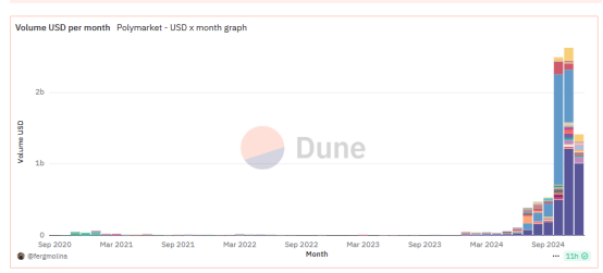 而受美国大选影响,另一神级应用浮出水面。Polymarket超越市面上所有的博彩平台,以高准确率在预测市场一炮而红。仅仅在10月份,Polymarket 网站的访问量达到 3500 万次,是FanDuel等热门博彩网站的两倍,月交易量也从4月的4000万美元激增至25亿美元。 广泛的用户与真实的需求等于明确的价值应用,不外乎V神对其赞不绝口,唯一可惜的是并未实现规模级的加密用户转换。 但媒体+博彩的新型融合体,无疑正缓步走来。