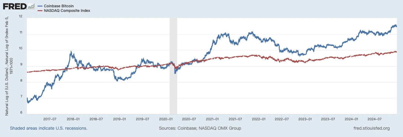 比特币和纳斯达克指数的对数比较。来源:FRED
