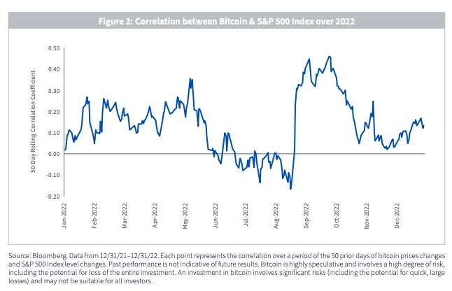 图表展示了 2022 年比特币价格与标普 500 指数之间的 50 天滚动相关性。从平均水平来看,相关性约为 0.1 ,高点超过 0.4 ,低点则低于-0.1 。来源:WisdomTree