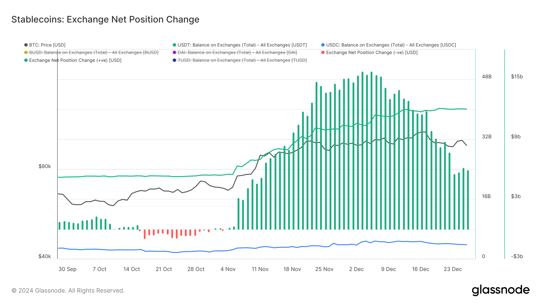 数据 显示 ,本周交易所资产呈现净流入状态,尤以美国大选后 USDT 的大量流入为主。此现象可能是投资者为即将到来的市场波动做準备,资金流入交易所可能意味著短期内的购𧹒需求提升。