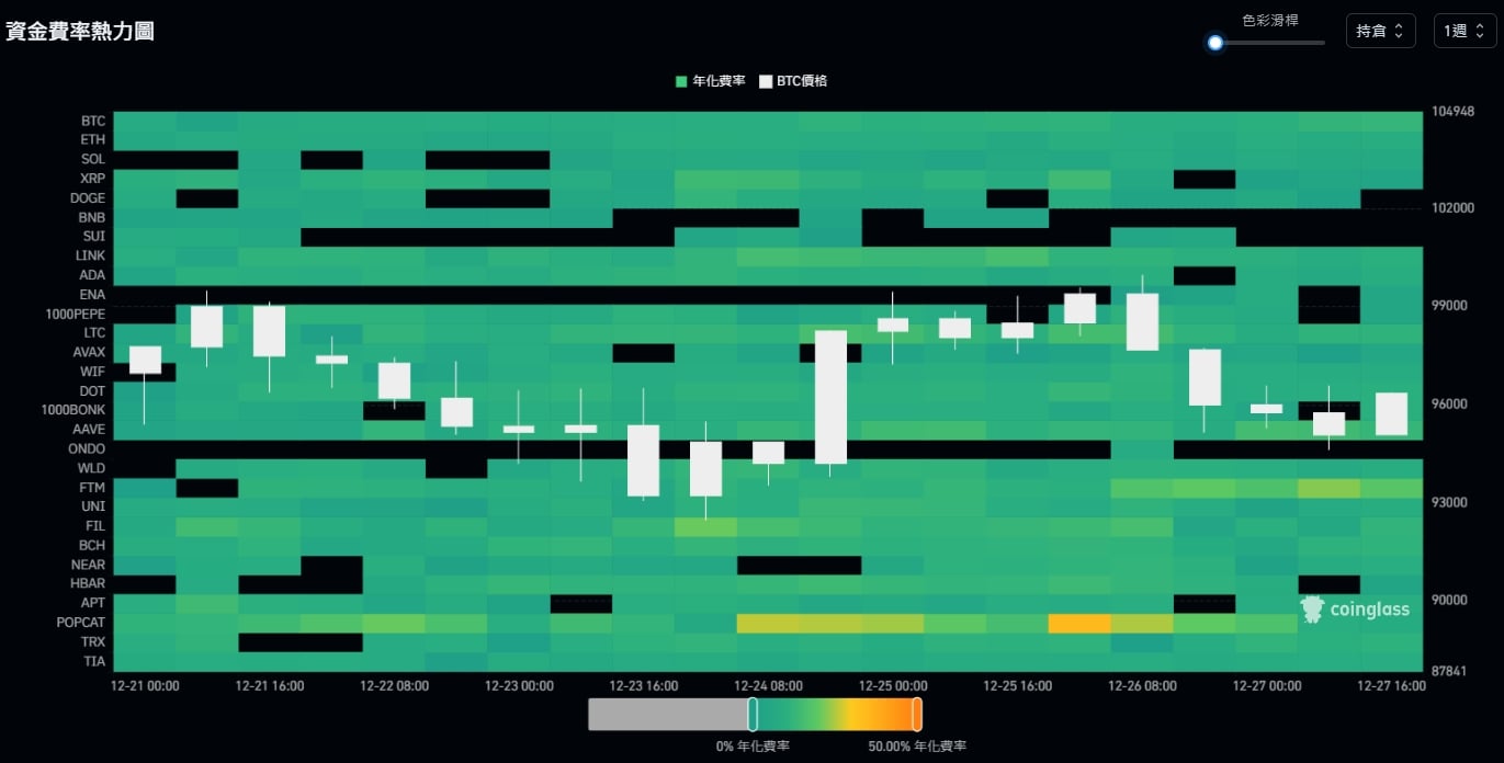 资金费率热力图 展示 了不同加密货币的资金费率变化趋势,颜色从零费率的绿色到 50% 正费率的黄色,黑色则代表负费率;白色 K 缐图则显示比特币价格波动,与资金费率形成对照。