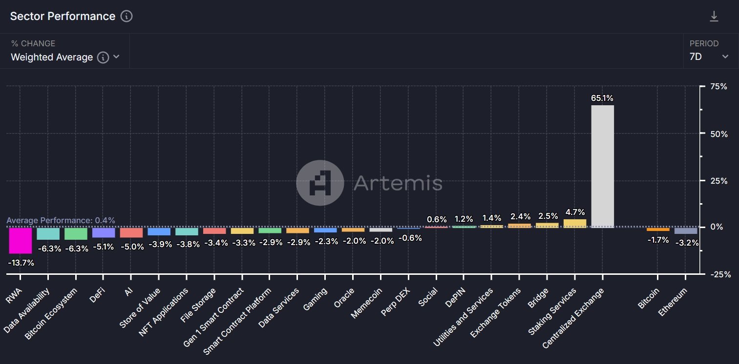 根据 Artemis 数据 显示 ,本周区块链领域板块的平均涨幅为 (0.4% ), 其中 Centralized Exchange 、 Staking Services 和 Bridge 分别以 (65.1%、4.7% 和 2.5% )占据前三。