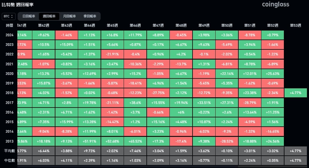 根据历史 数据 第 55 周,比特币的回报率为 +0.79% 。这一表现低于历史周平均回报率( +3.02% )和高于中位数( +0.05% ),且与前一周第 51 周的回报( -8.78% )有所好转。