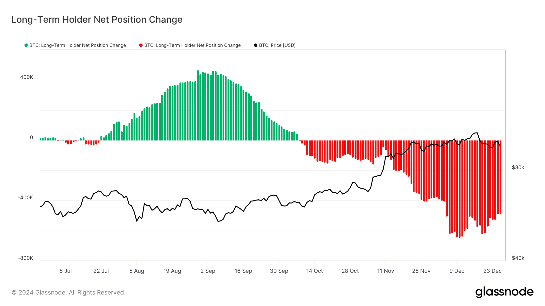 根据链上 数据 ,比特币的长期持有者净持仓量近期出现显著下降,红色条形图显示出自 10 月以来抛售压力逐步加大。尤其是在比特币价格突破新高并接近十万美金时,长期持有者的净仓位变化由正转负,表明部分投资者选择在高位进行获利了结。