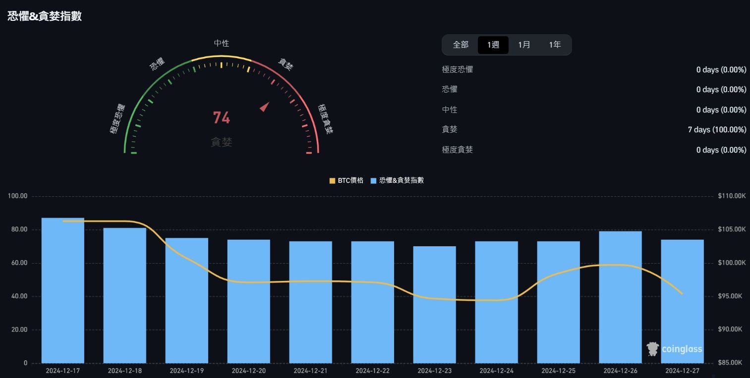 本周的市场情绪 指标 由 73 (贪婪)上升至 74 (贪婪),整周在(贪婪)的区间。